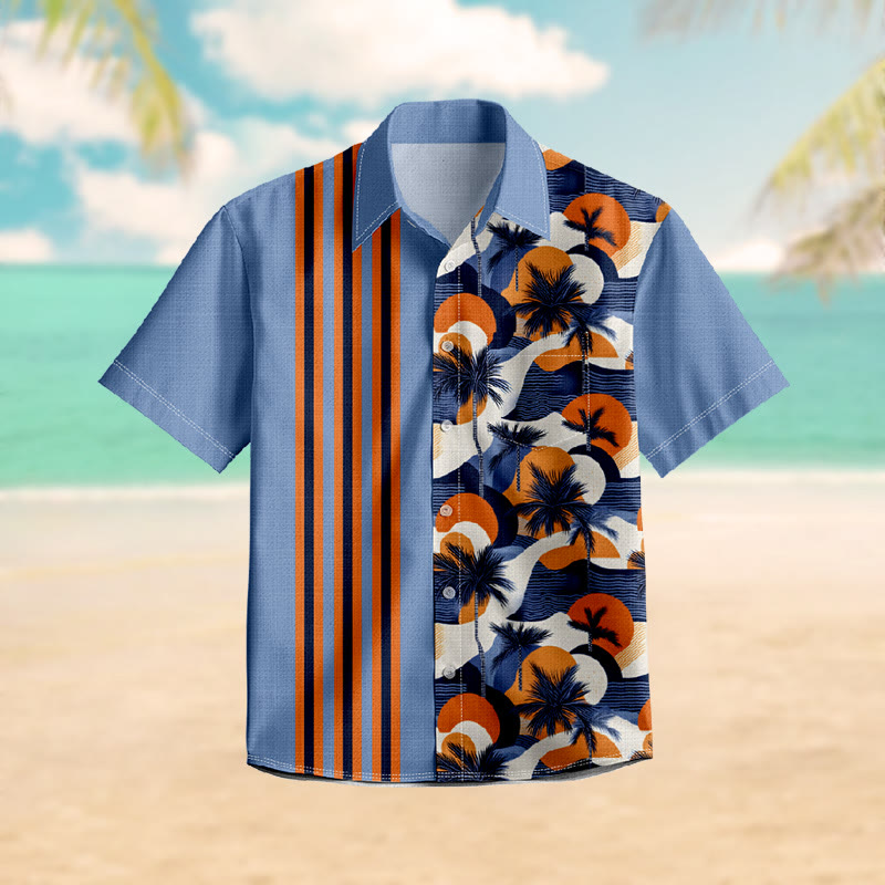 100% Cotton Retro Striped Sunset Palm Trees Print Short Sleeve Shirt