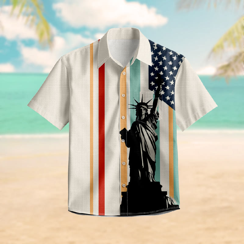 100% Cotton Striped Statue Of Liberty Print Short Sleeve Shirt