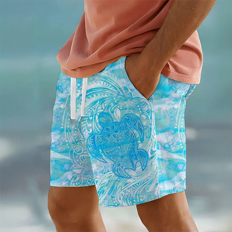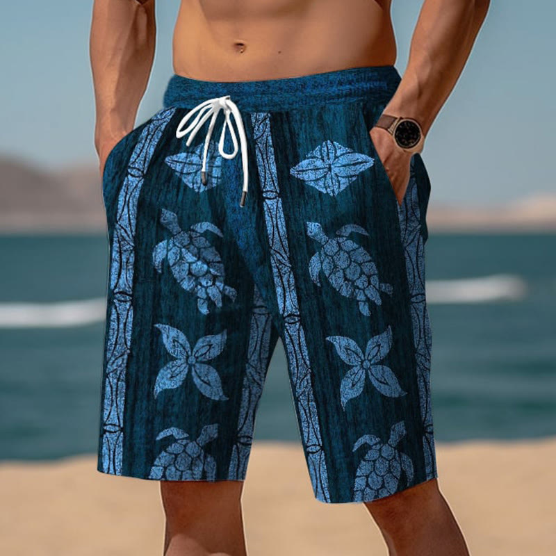 Casual Men's Hawaiian Totem Turtle Print Beach Shorts