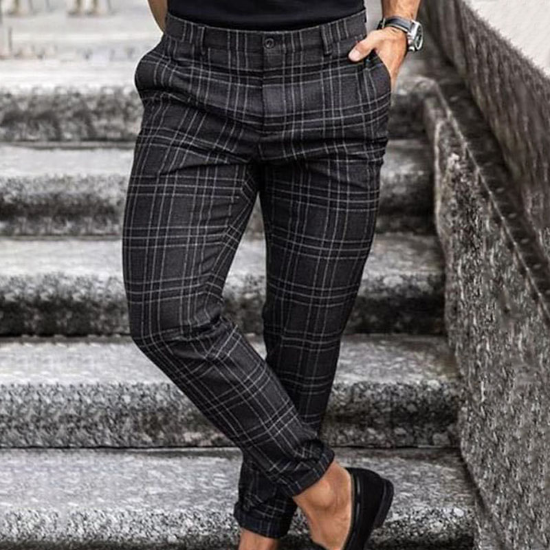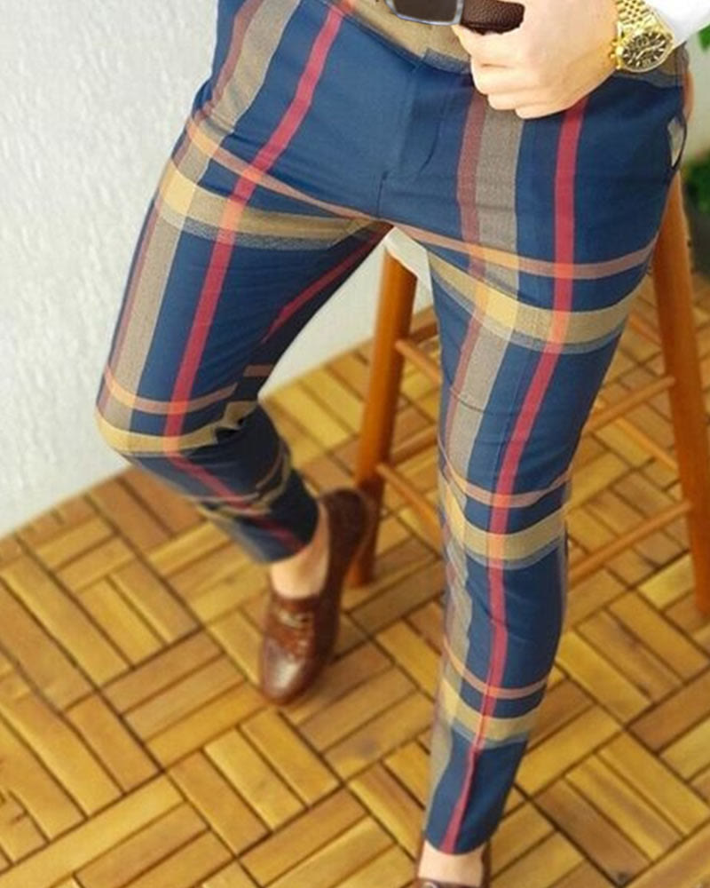 Men's Business Plaid Print Casual Pocket Trousers