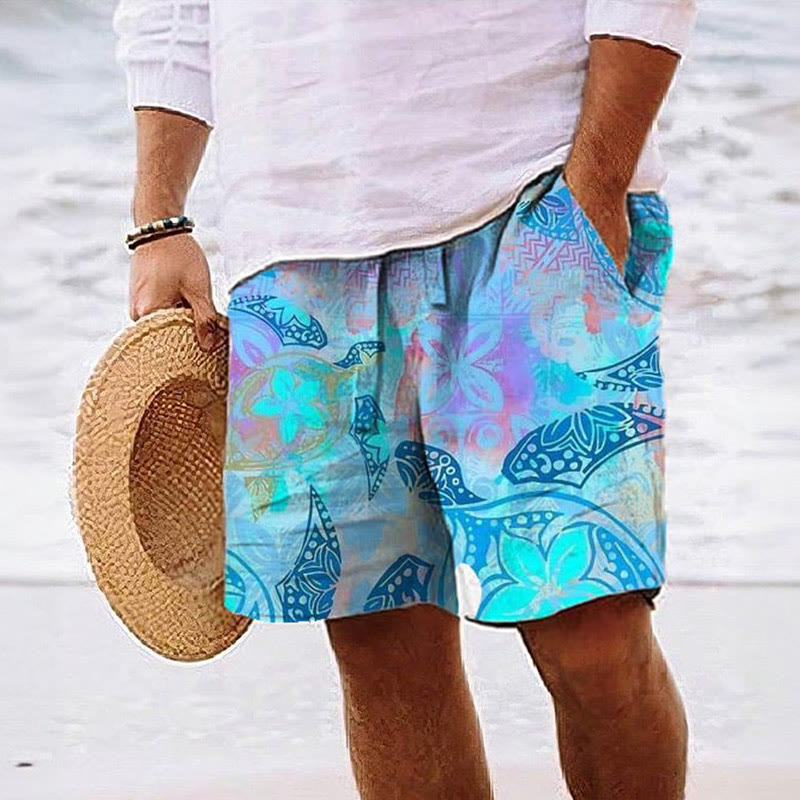 Summer Men's Ethnic Turtle Floral Print Beach Shorts