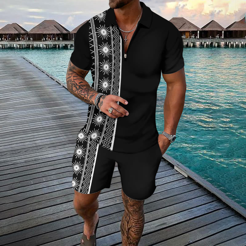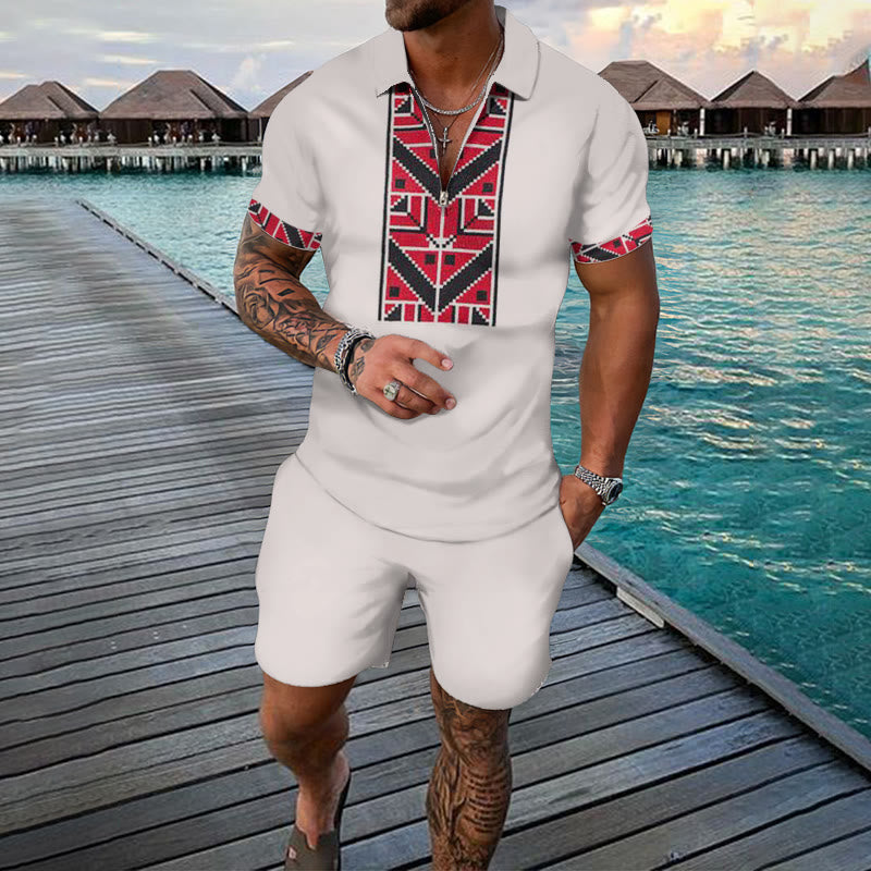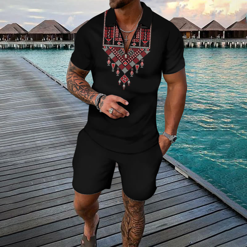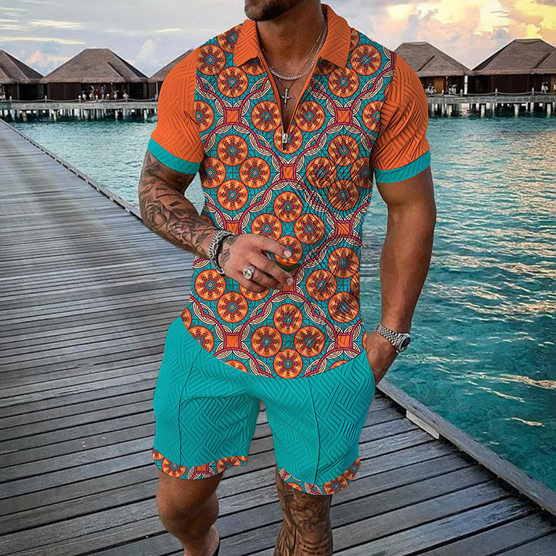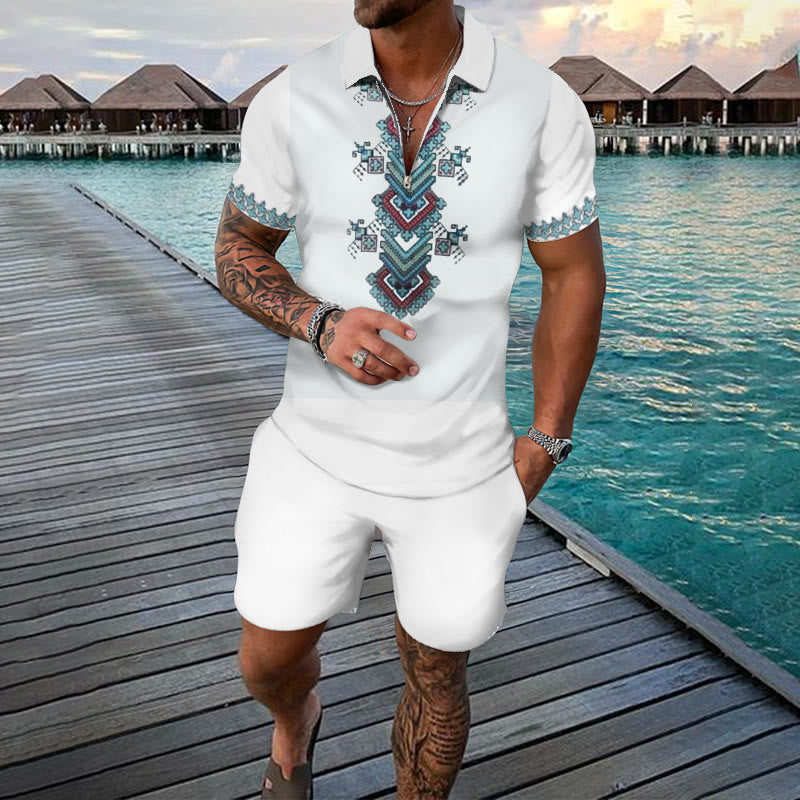 Men's Two Tone Ethnic Print Casual Short-sleeved Polo Set
