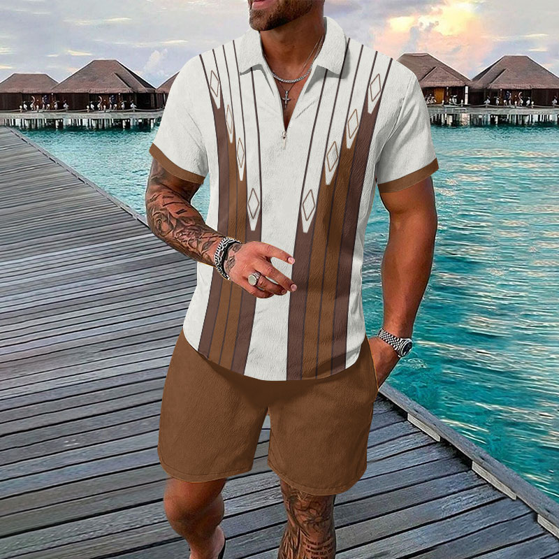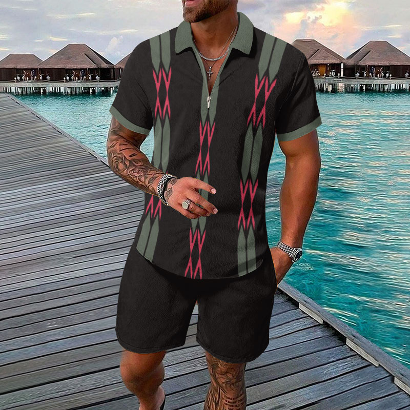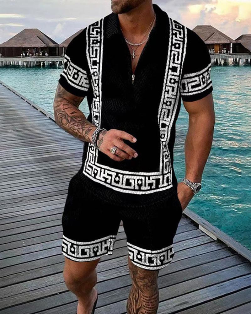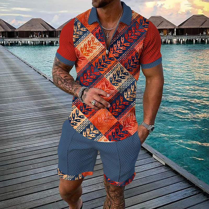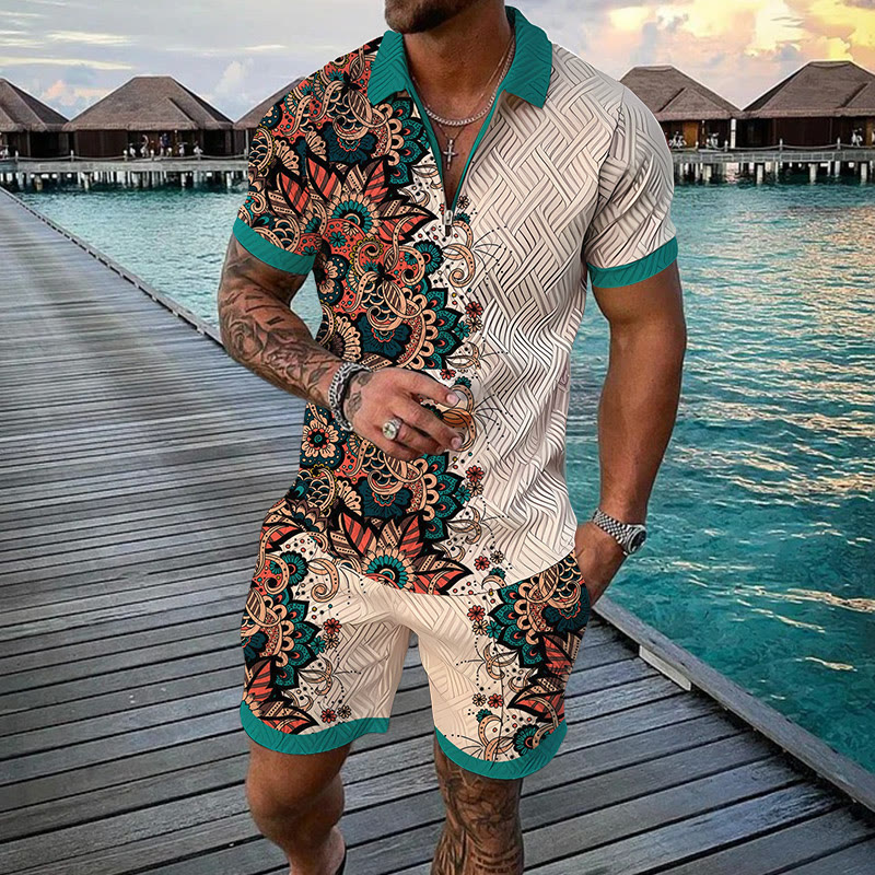 Men's Two Tone Ethnic Print Casual Short-sleeved Polo Set