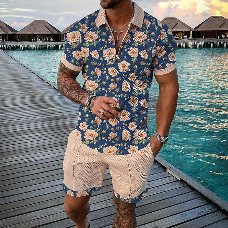 Men's Flower Solstice Print Casual Short-sleeved Polo Set