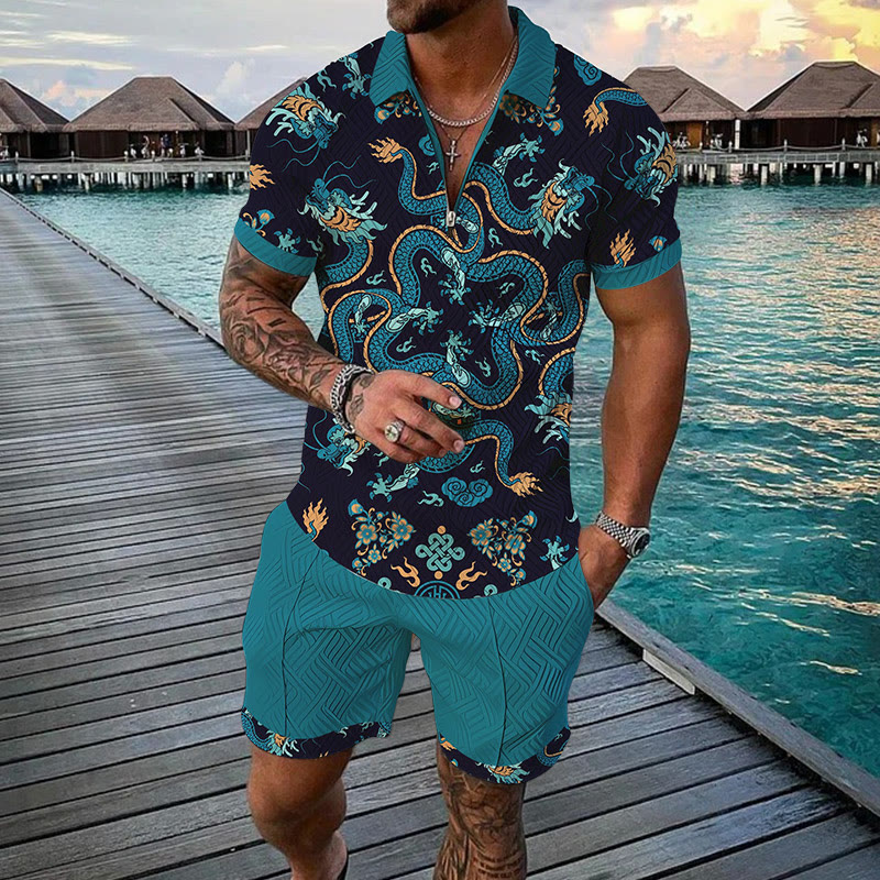 Men's Azure Ethnic Print Casual Short-sleeved Polo Set