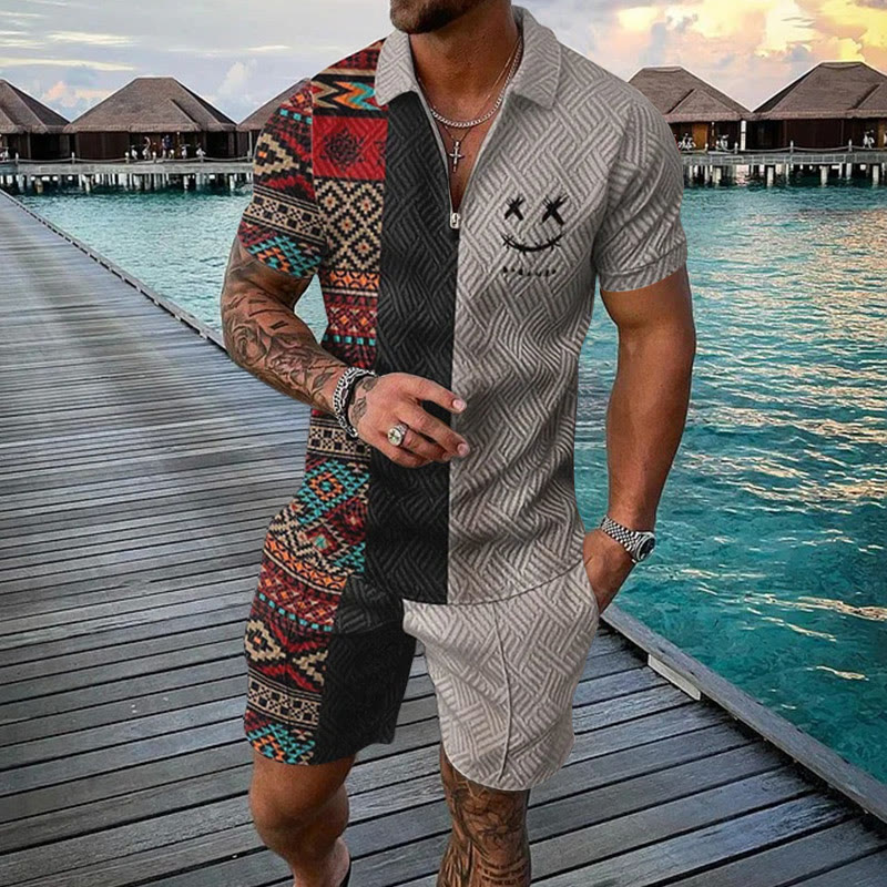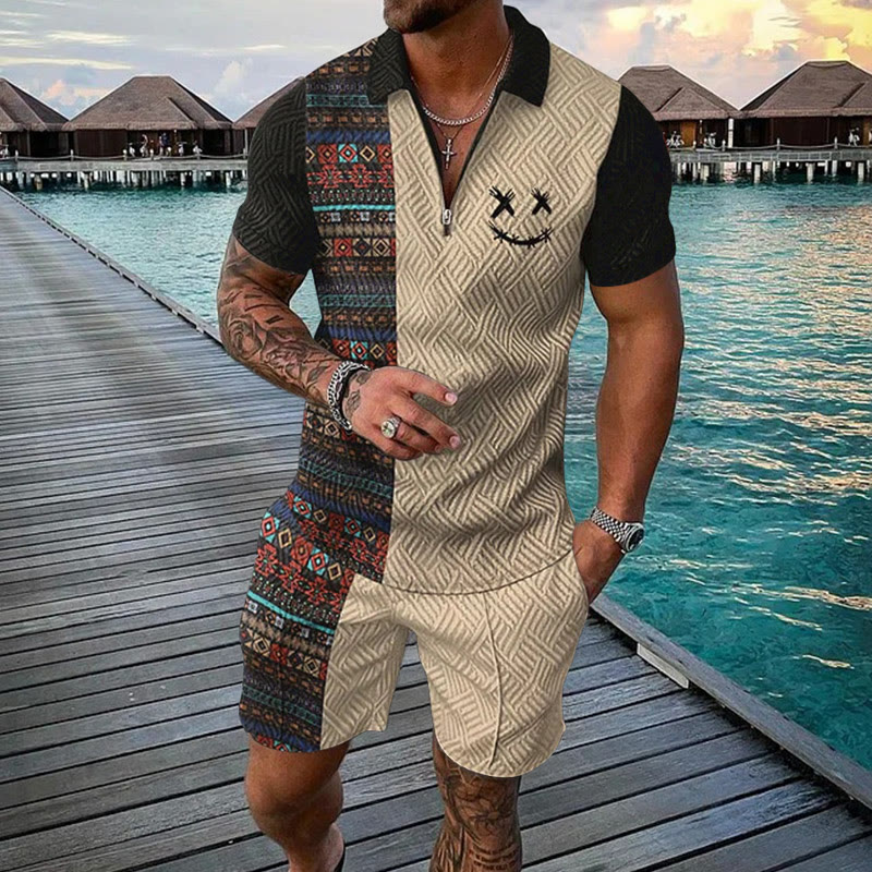 Men's Ethnic Totem Smiley Face Print Casual Short-sleeved Polo Set