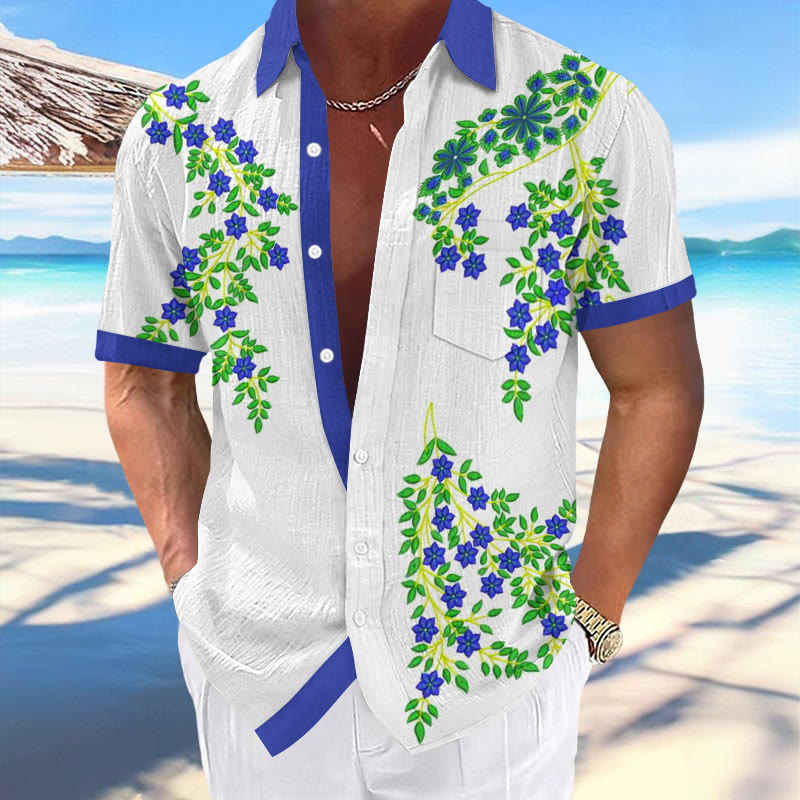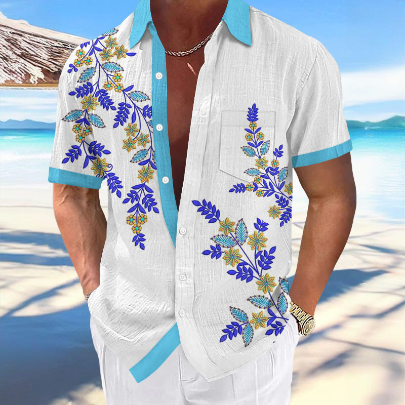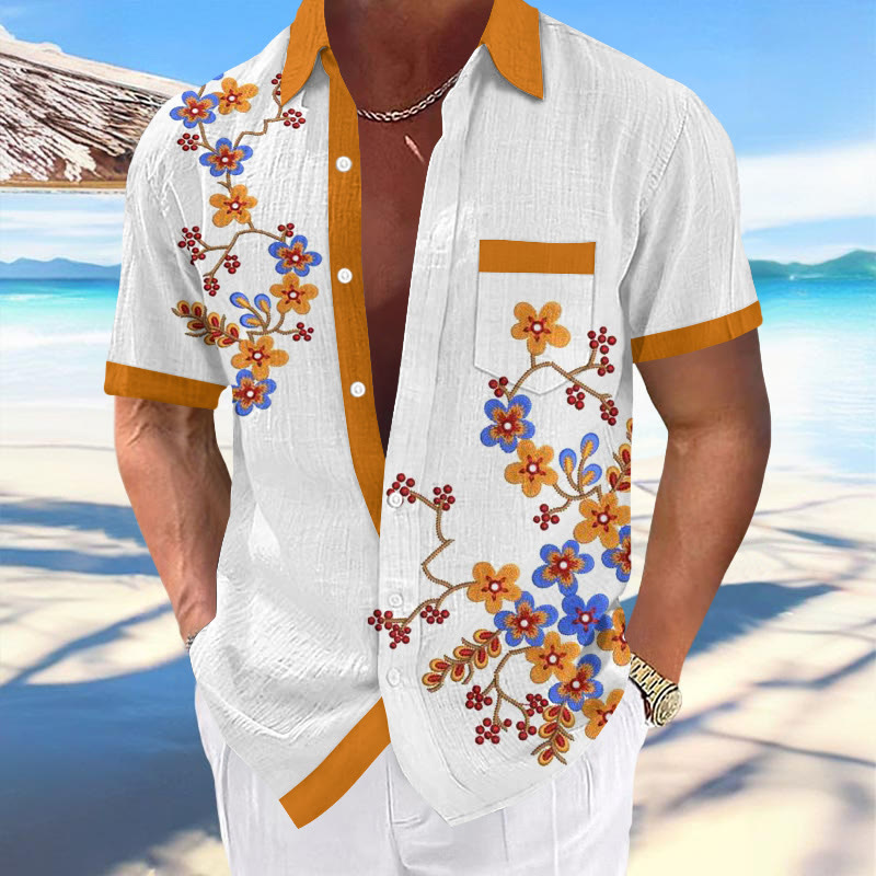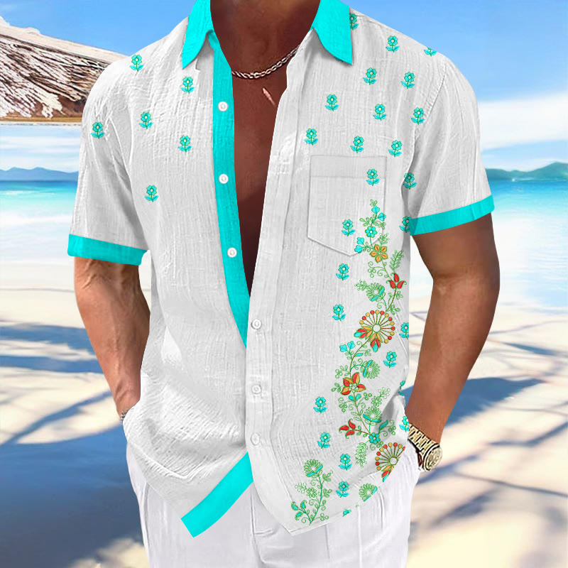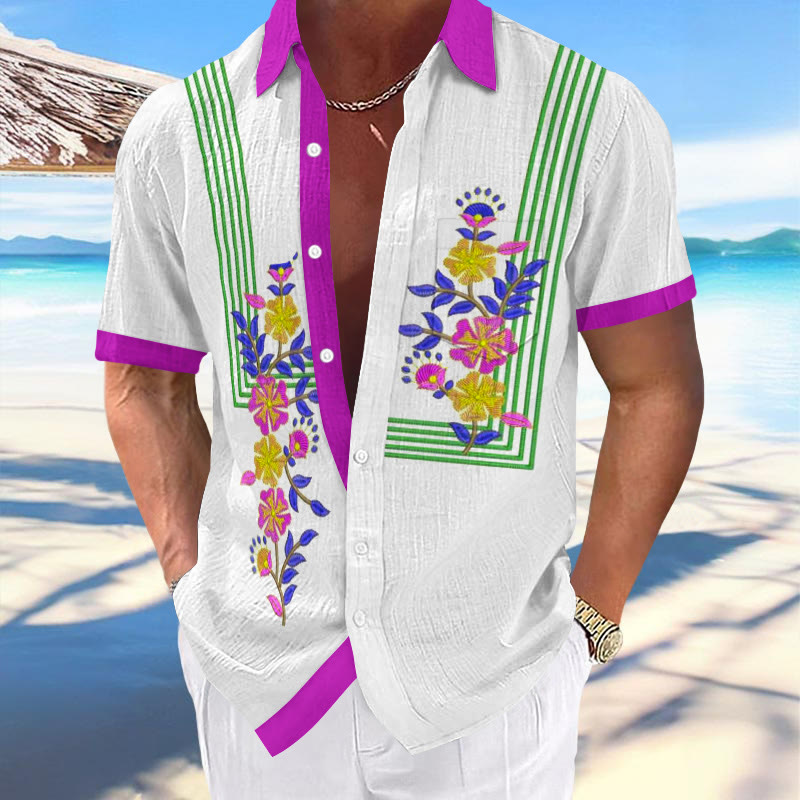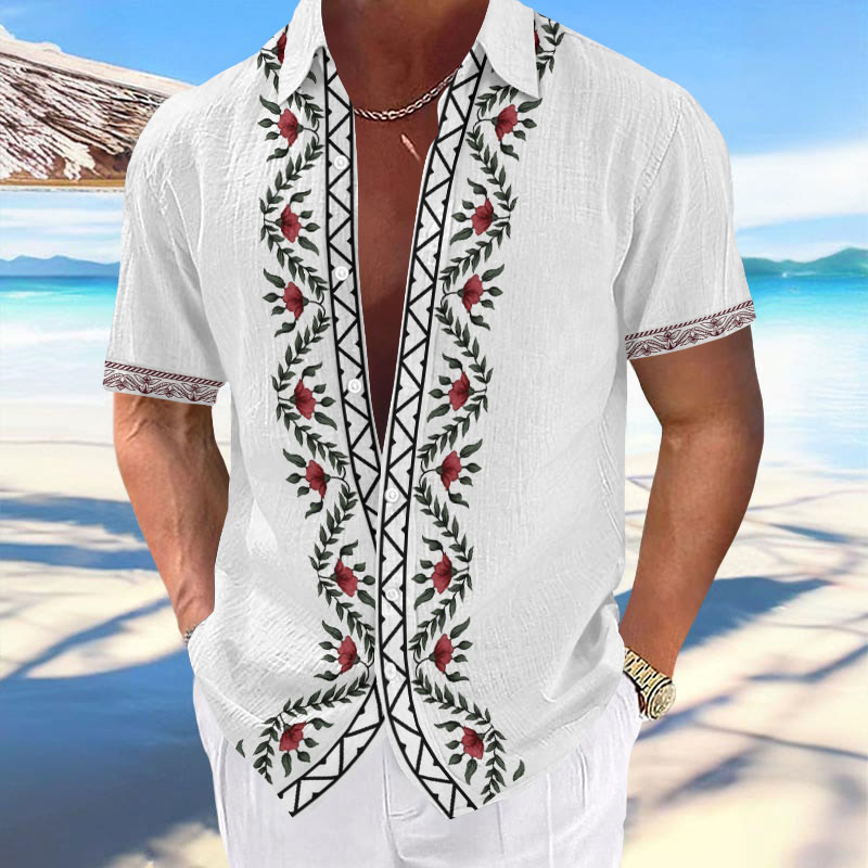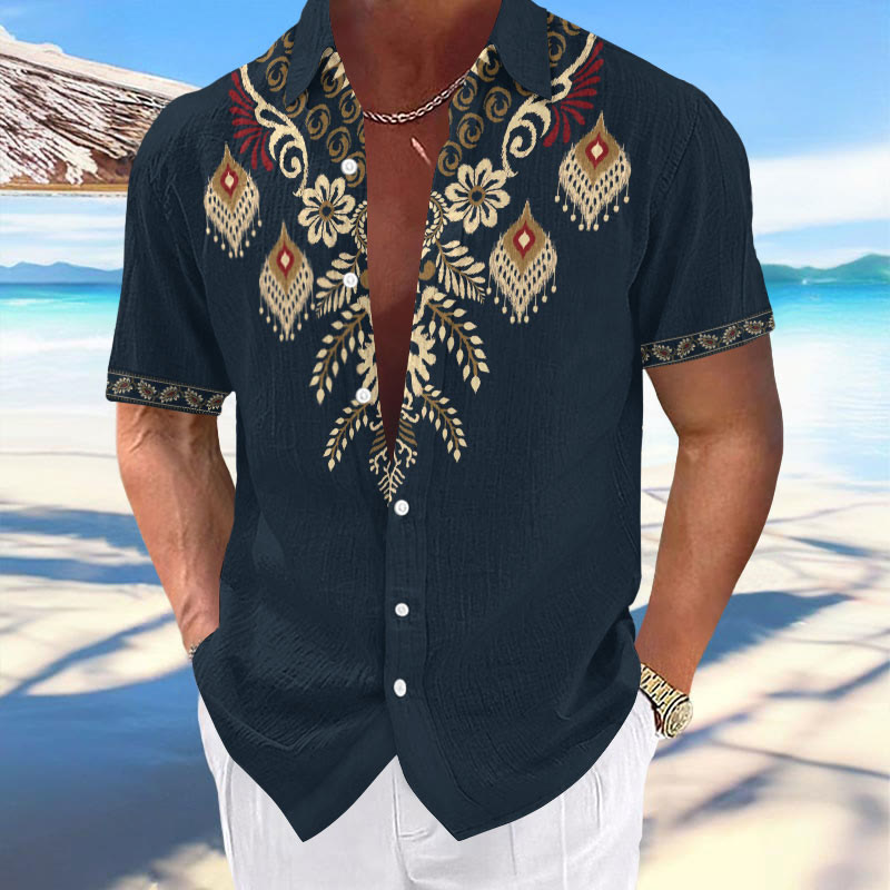 100% Cotton Ethnic Floral Pattern Print Short Sleeve Shirt