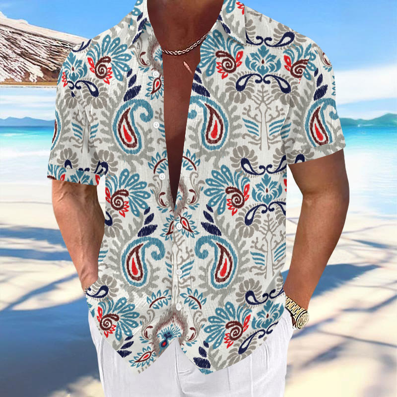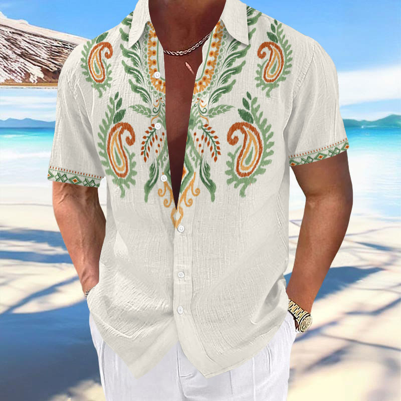 Men's Casual Retro Ethnic Floral Paisley Print Short Sleeve Lapel Shirt