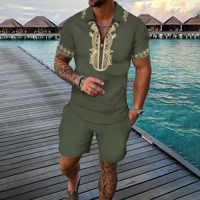 Men's Casual Ethnic Totem Print Short Sleeve Polo Set