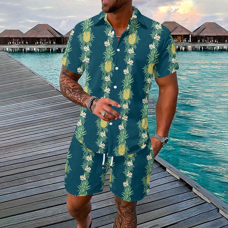 Men's Vacation Simple Pineapple Express Print Short-sleeve Hawaiian Shirt Set