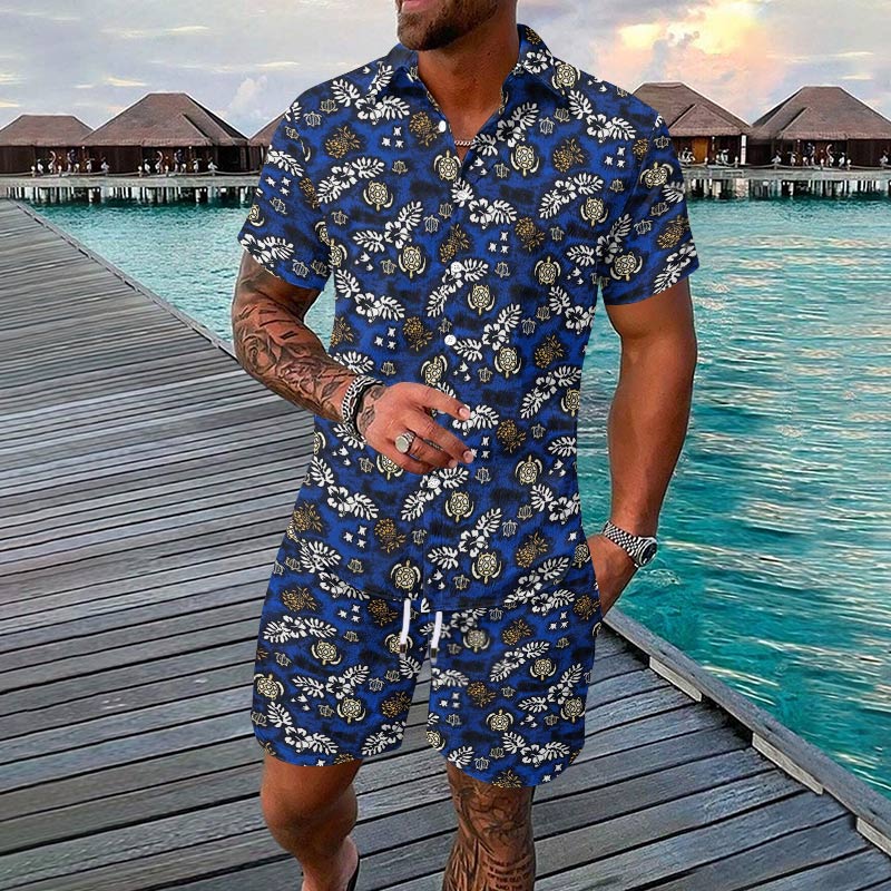 Men's Resort Casual Tropical Plant Turtle Print Short-sleeve Hawaiian Shirt Set
