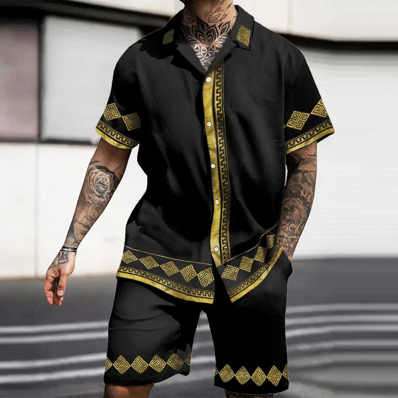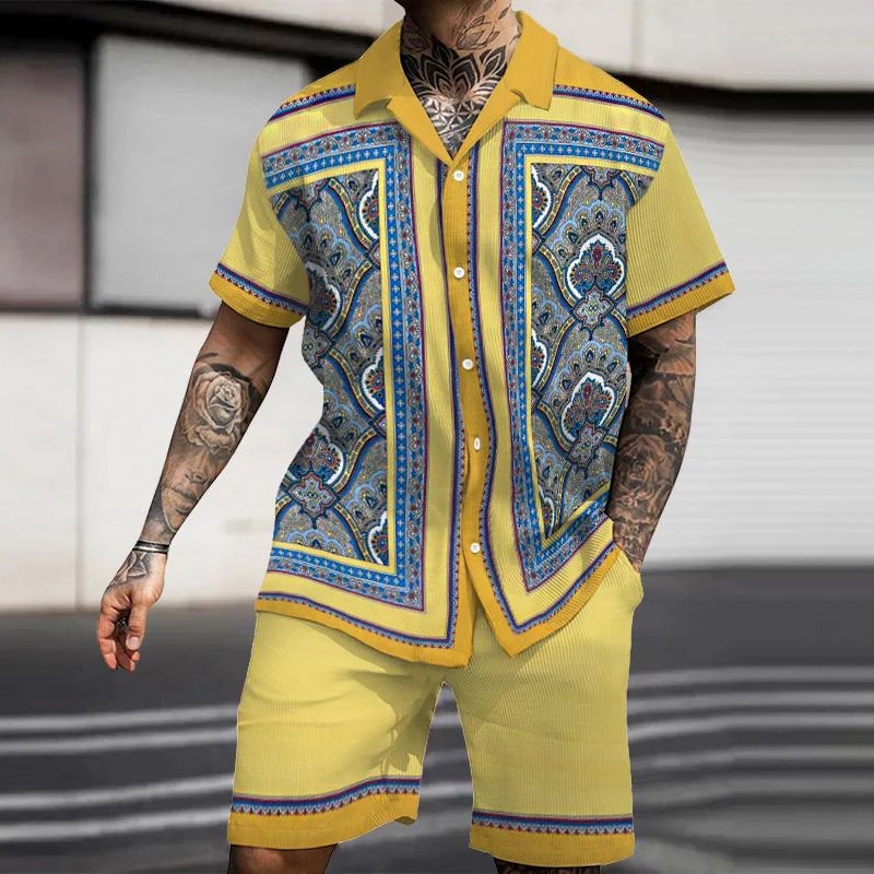 Vintage Totem Splicing Stripe Print Short Sleeve Shirt Set