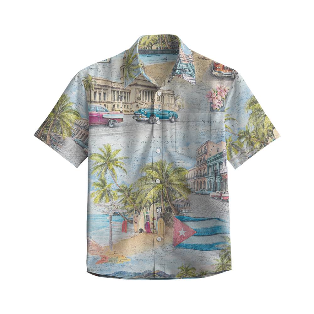 100% Cotton Men's Beige Hawaii Street Print Short Sleeve Shirt