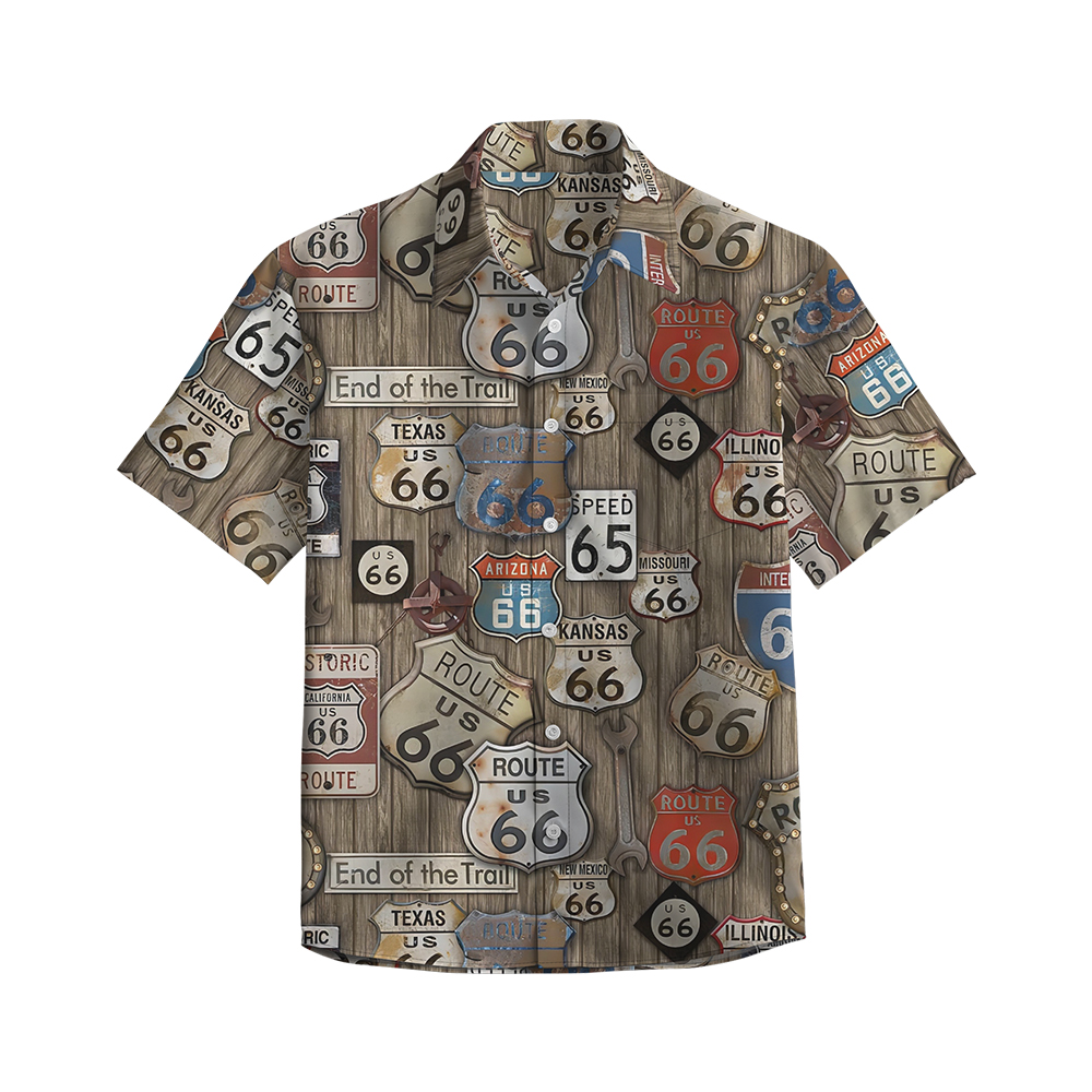 100% Cotton Men's Brown Vintage Road 66 Pop Print Short Sleeve Shirt